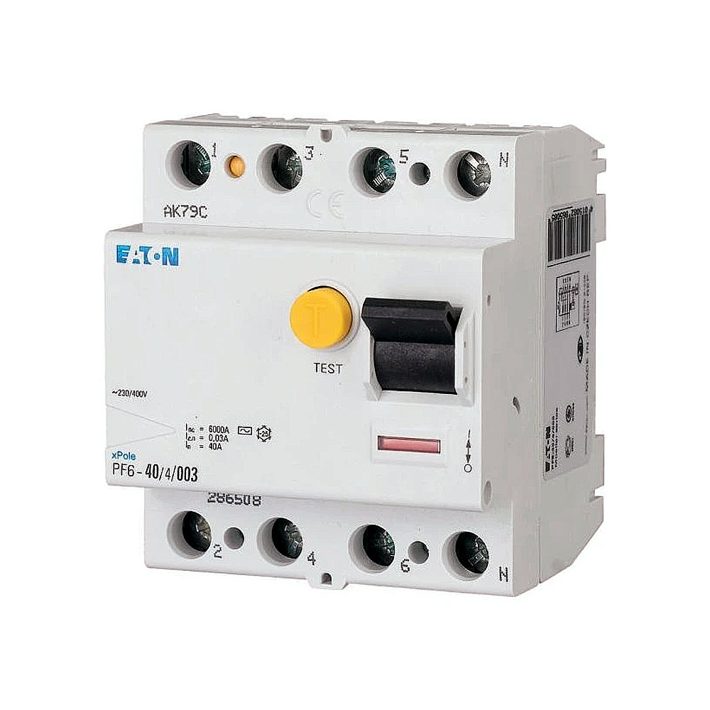Tento 4pólový proudový chránič Eaton série PF6 je určen pro třífázové obvody s odběrem do 25 A . S citlivostí 30 mA chrání osoby před úrazem elektrickým proudem a majetek před požárem . Verze Typ A je nezbytná pro moderní instalace, protože detekuje i pulsující DC proudy , které běžný typ AC nezachytí.