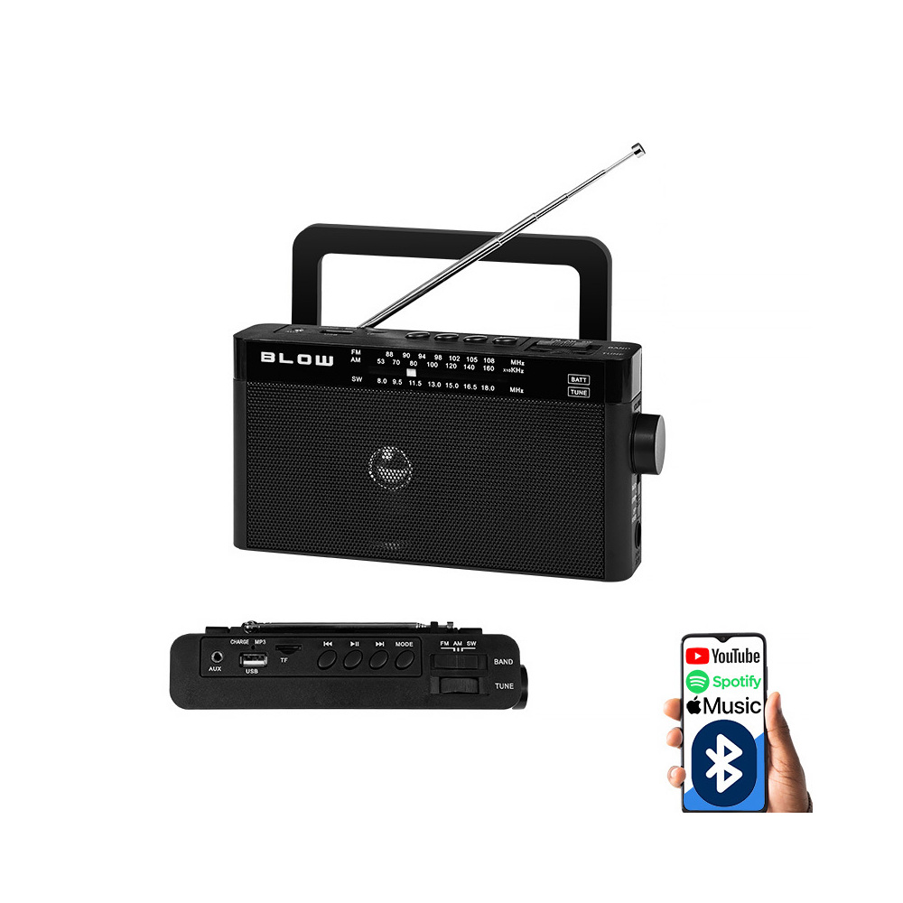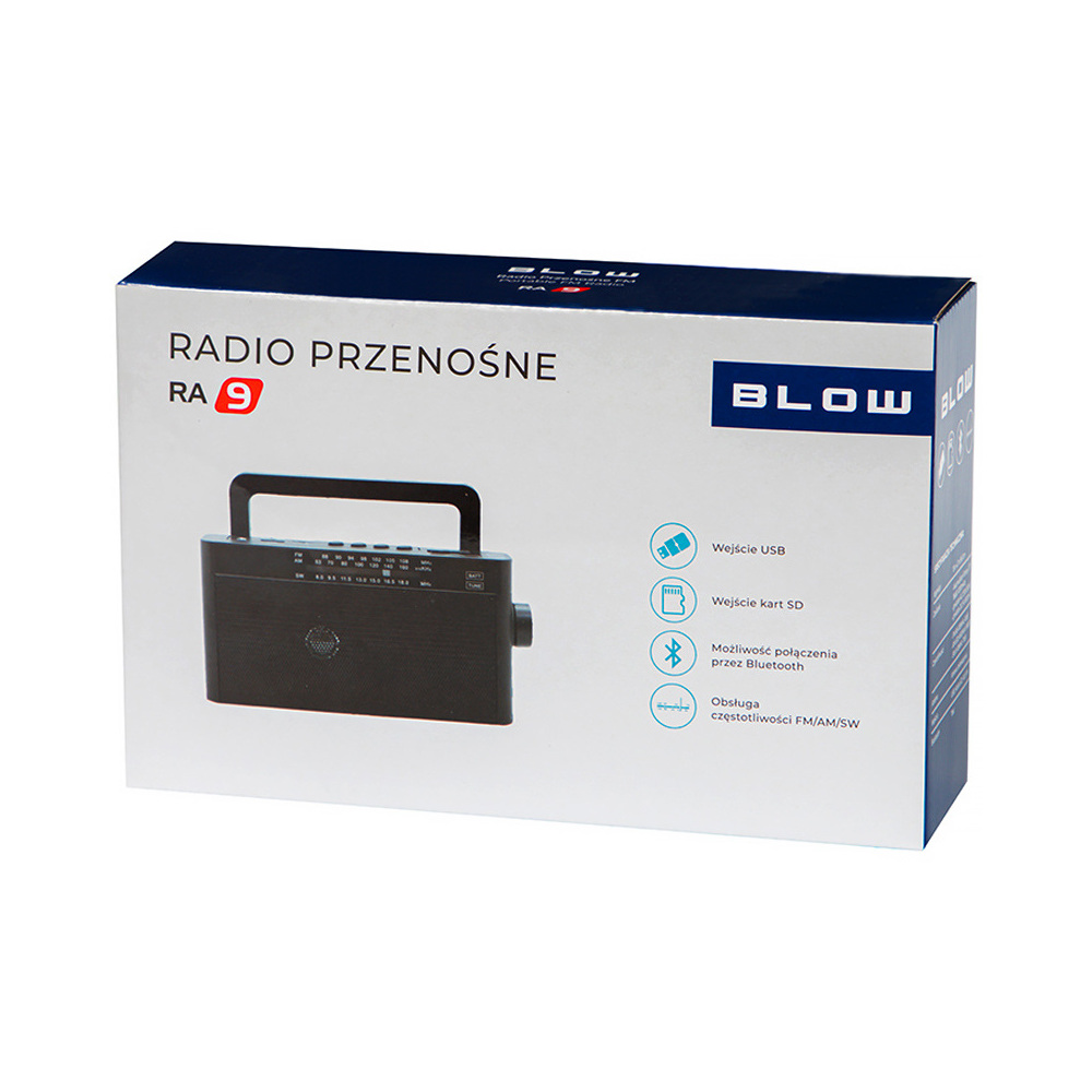 Přenosné rádio BLOW RA9 se základními funkcemi umožňující příjem rozhlasových stanic ve frekvencích FM/AM/SW. Ideální využití pro piknik s přáteli venku, během rodinného výletu, odpočinku doma nebo v práci. Díky připojení Bluetooth vám rádio umožní vychutnat si vaši oblíbenou hudbu.