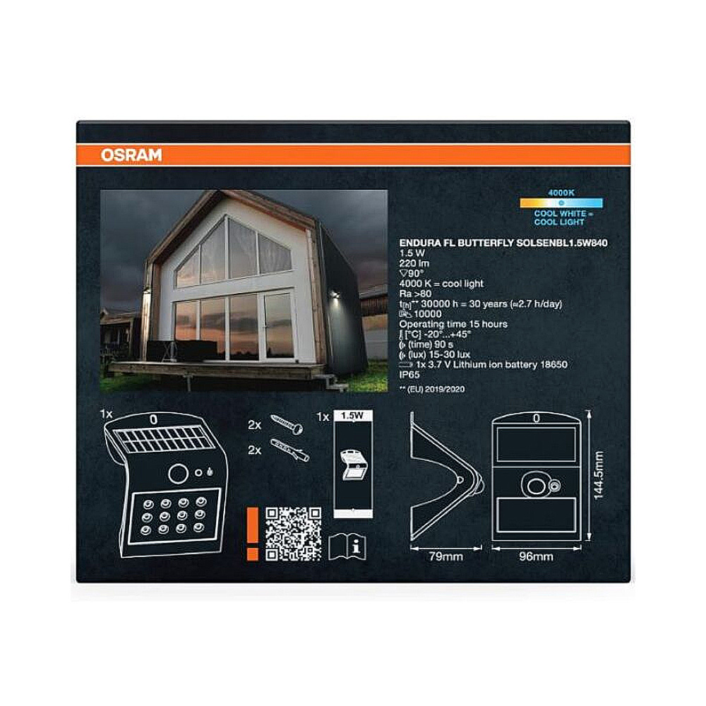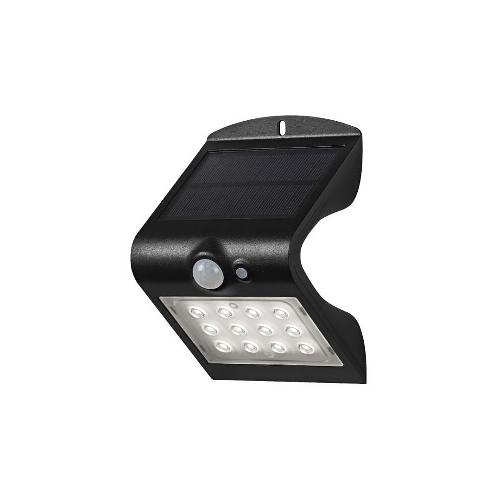 Vonkajší reflektor s integrovaným solárnym napájaním a pohybovým a svetelným senzorom ‒ výkon: 1,50 W • svetelný tok: 220 lm • farba svetla: neutrálna biela (4000K) • materiál: plast+sklo • farba: čierna • rozmery: 15 x 10 x 8 cm