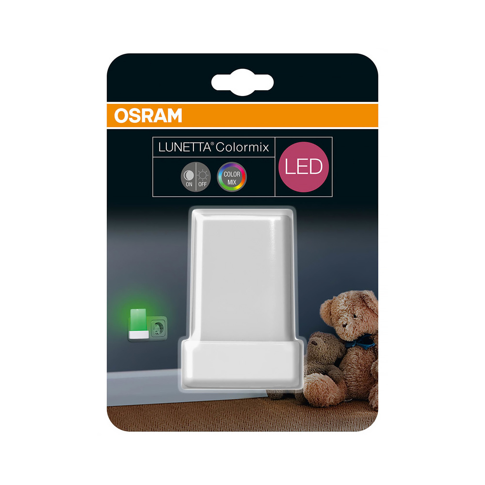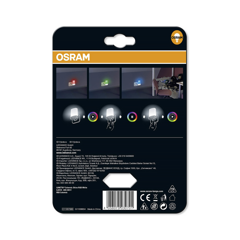 Nočné svetlo Osram Lunetta Shine RGB sa inštaluje priamo do objímky a pomaly mení farbu z jednej farby na druhú. Farbu je možné zastaviť na požadovanej farbe pomocou tlačidla na spodnej strane. Súmrakový spínač automaticky zapne svetlo, keď sa zotmie, a vypne ho, keď je dostatočne jasné. Hodnoty jasu sú zabudované, nie sú nastaviteľné. Ideálne ako nočné svetlo napríklad do detskej izby. Len na vnútorné použitie.
