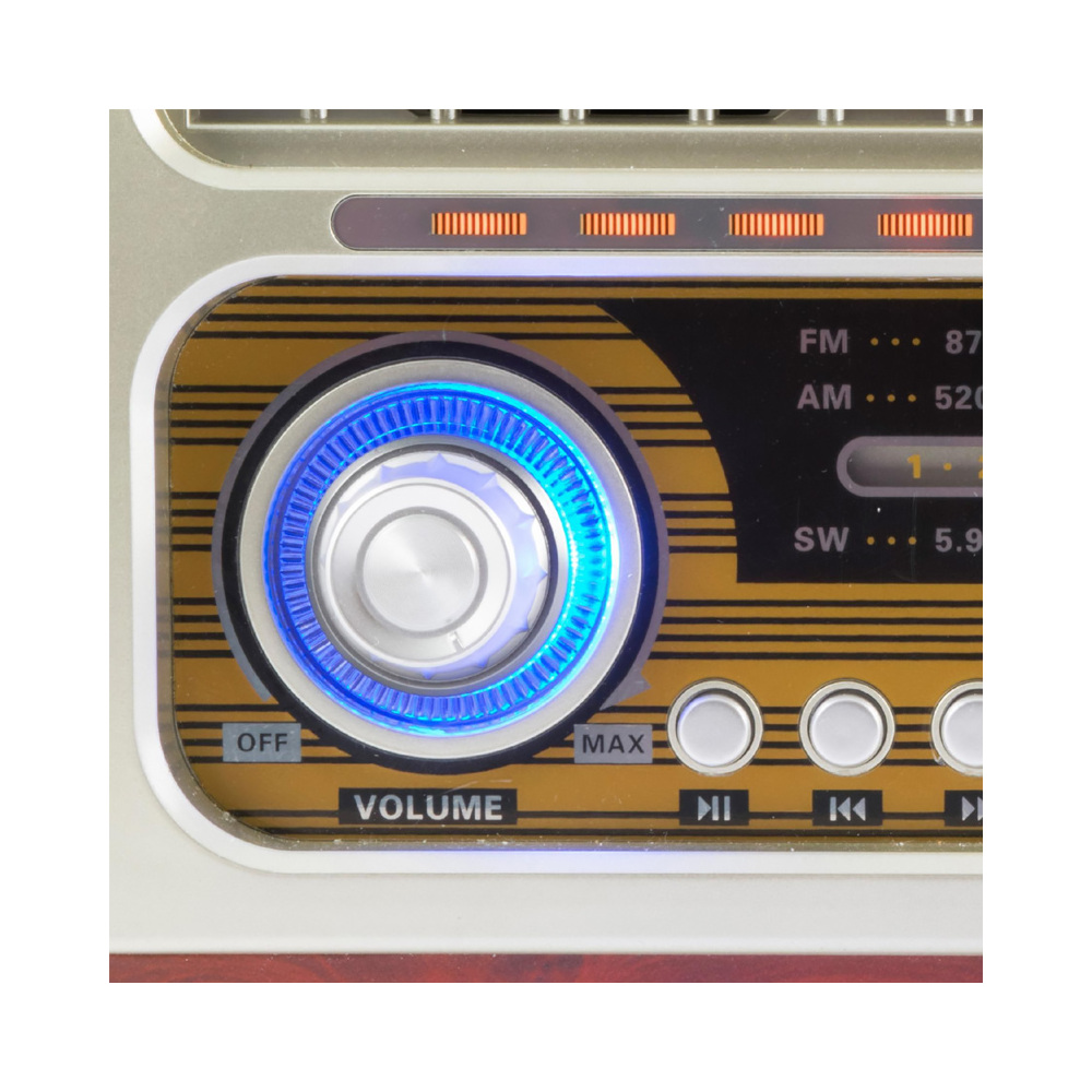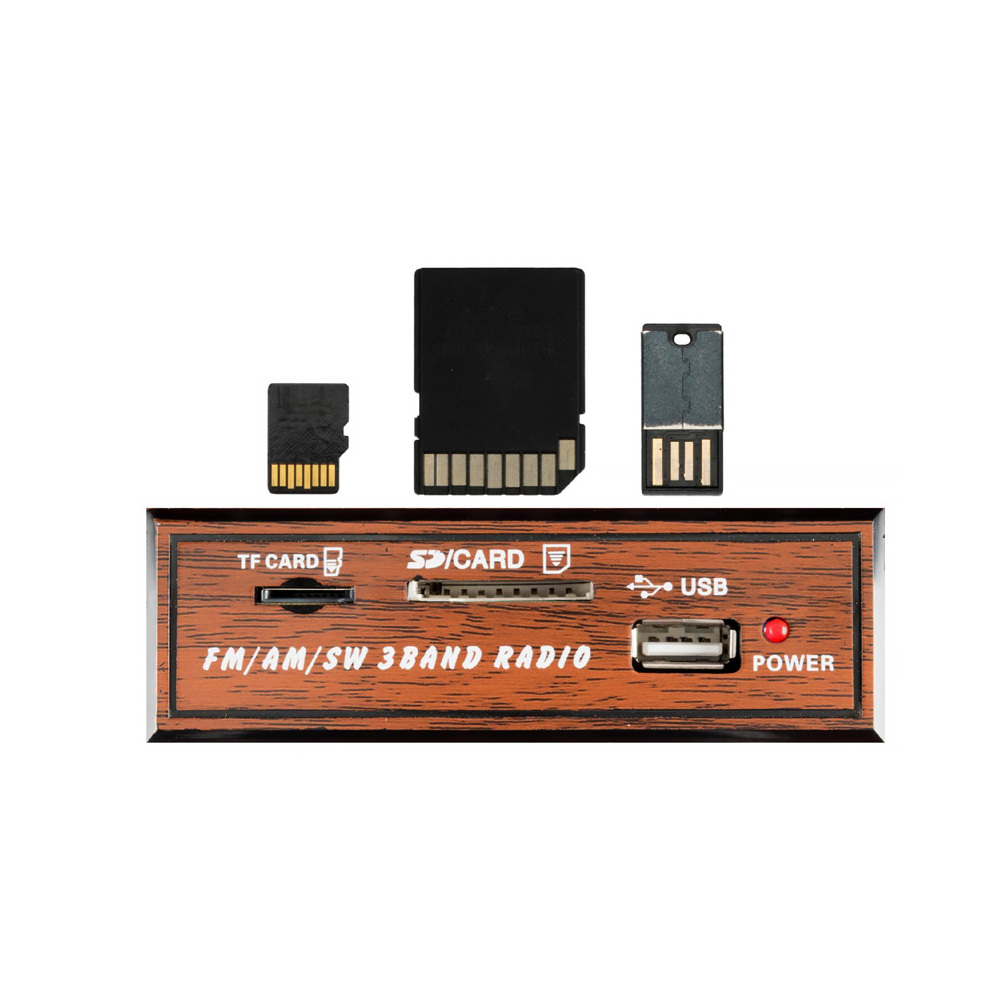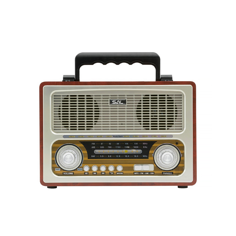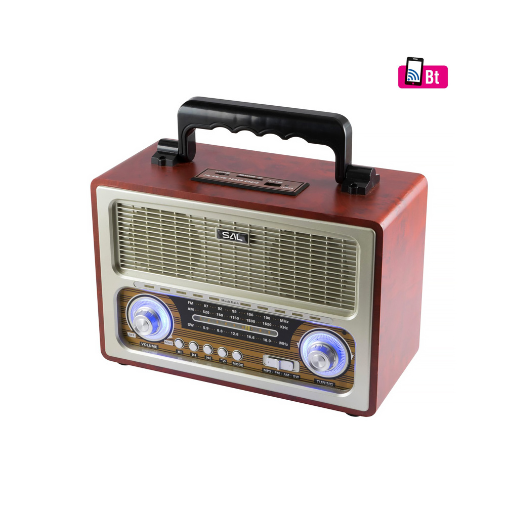 Retro prenosné rádio, AC-DC, MP3-BT, 3-pásmový ‒ 4in1: BT MP3 AUX rádio • prehrávanie hudby z mobilného telefónu, počítača • prehrávanie MP3 súborov z USB/SD/microSD • konektor AUX IN • 3 pásmový AM-FM-SW rádioprijímač • zvukové hlásenia pri prepínaní • klasická drevená skrinka s držiakom • napájanie: sieťový kábel je príslušenstvom, 6V DC adaptér (nie je súčasťou), 4xD/LR20 (1,5V) batérie (nie sú príslušenstvom)