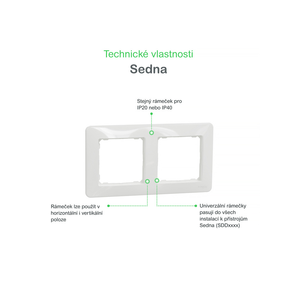 Biely dvojdielny rám Sedna, súčasť série Sedna Design od Schneider Electric. Rám má lesklý biely povrch a rozmery: šírka 156 mm, výška 85 mm a hĺbka 10 mm. Má stupeň krytia IP20. Rám je vyrobený z termoplastu so zvýšenou odolnosťou voči UV žiareniu. Je určený na povrchovú montáž.