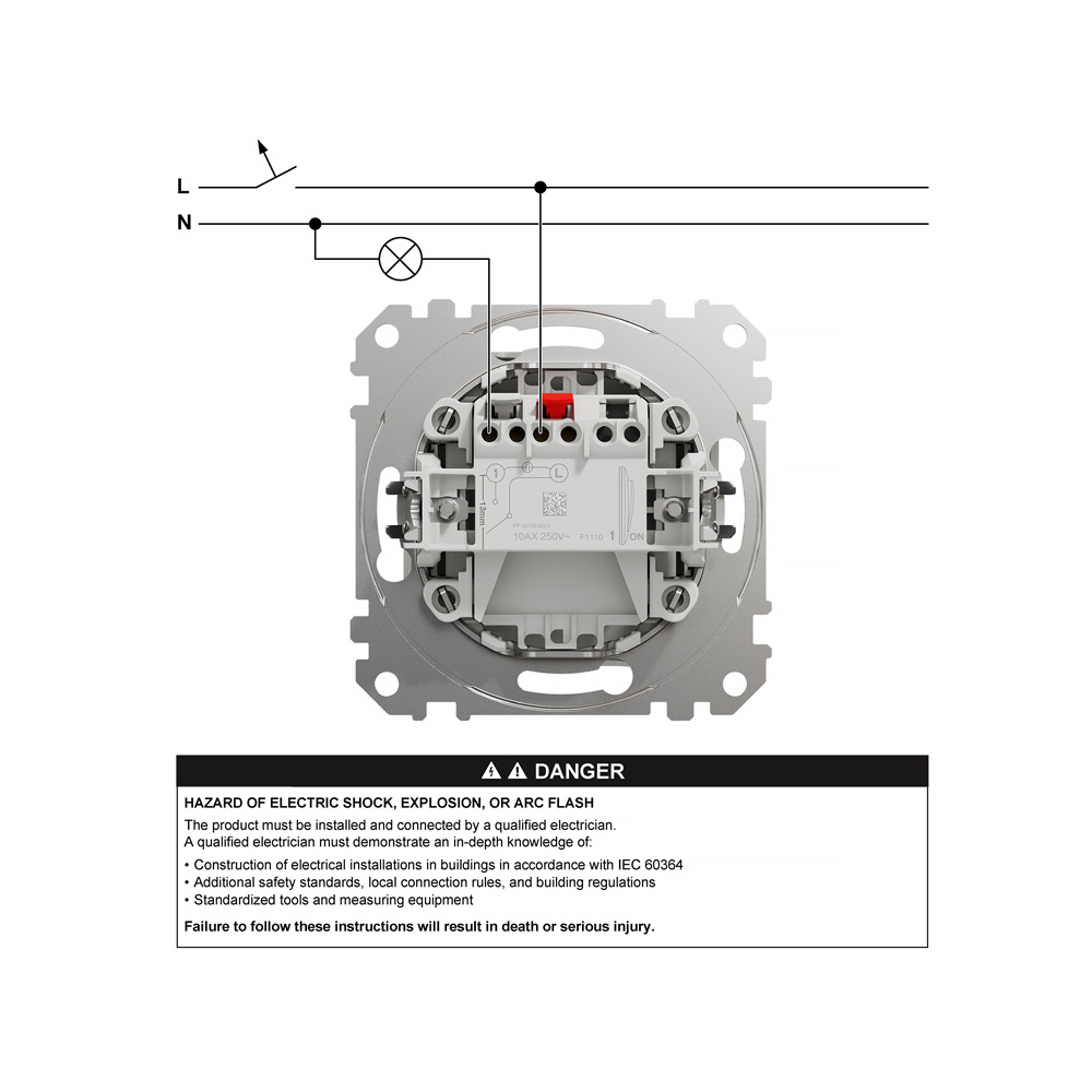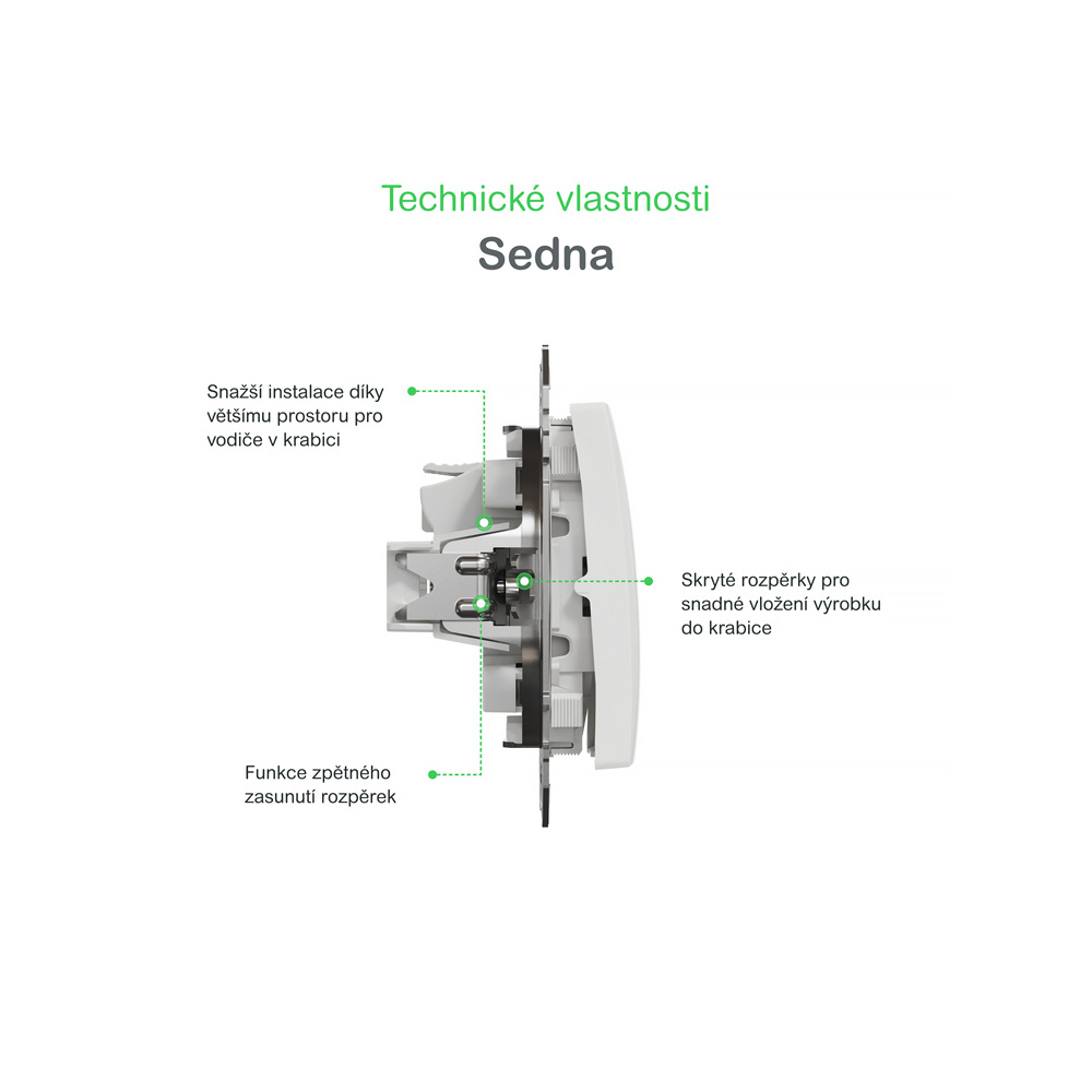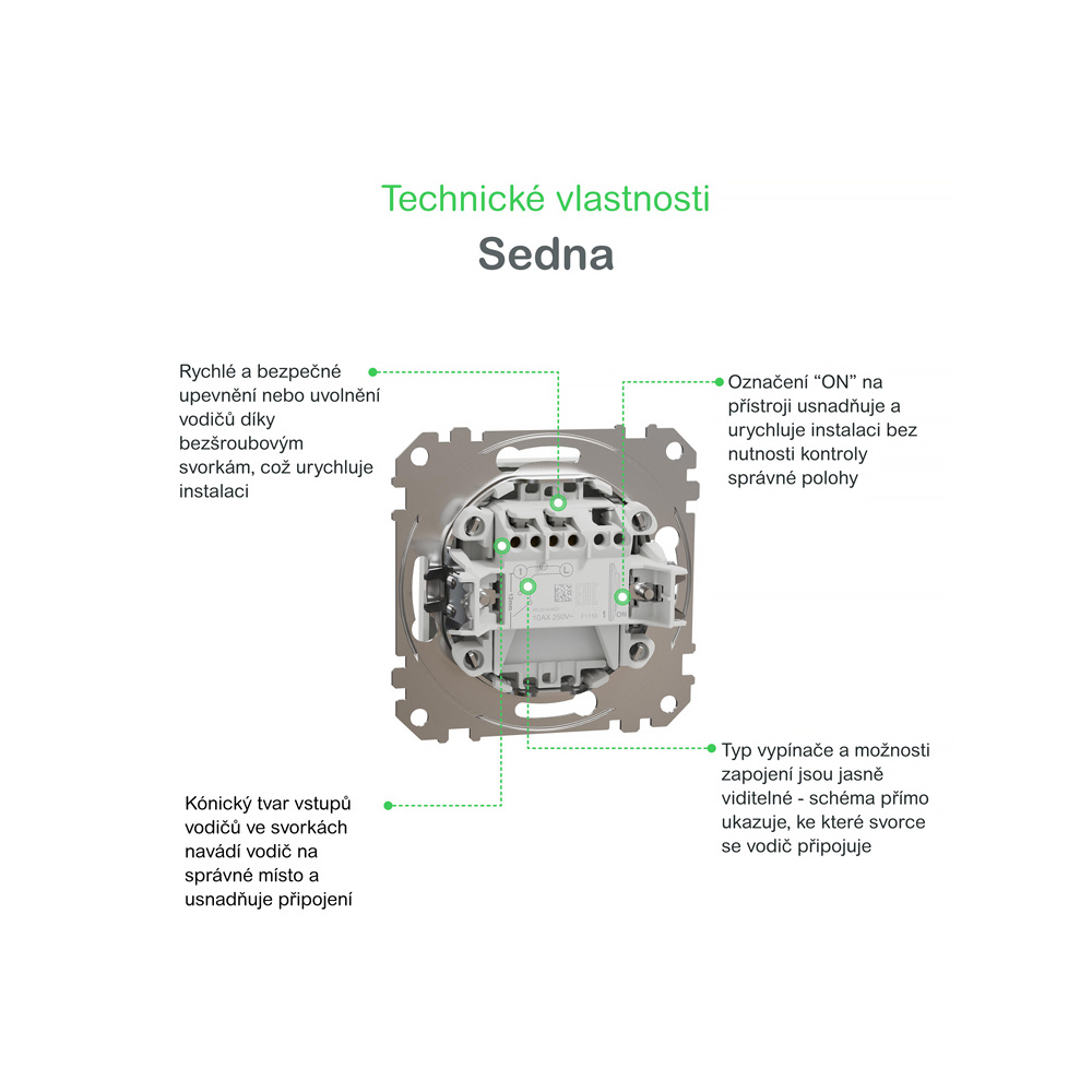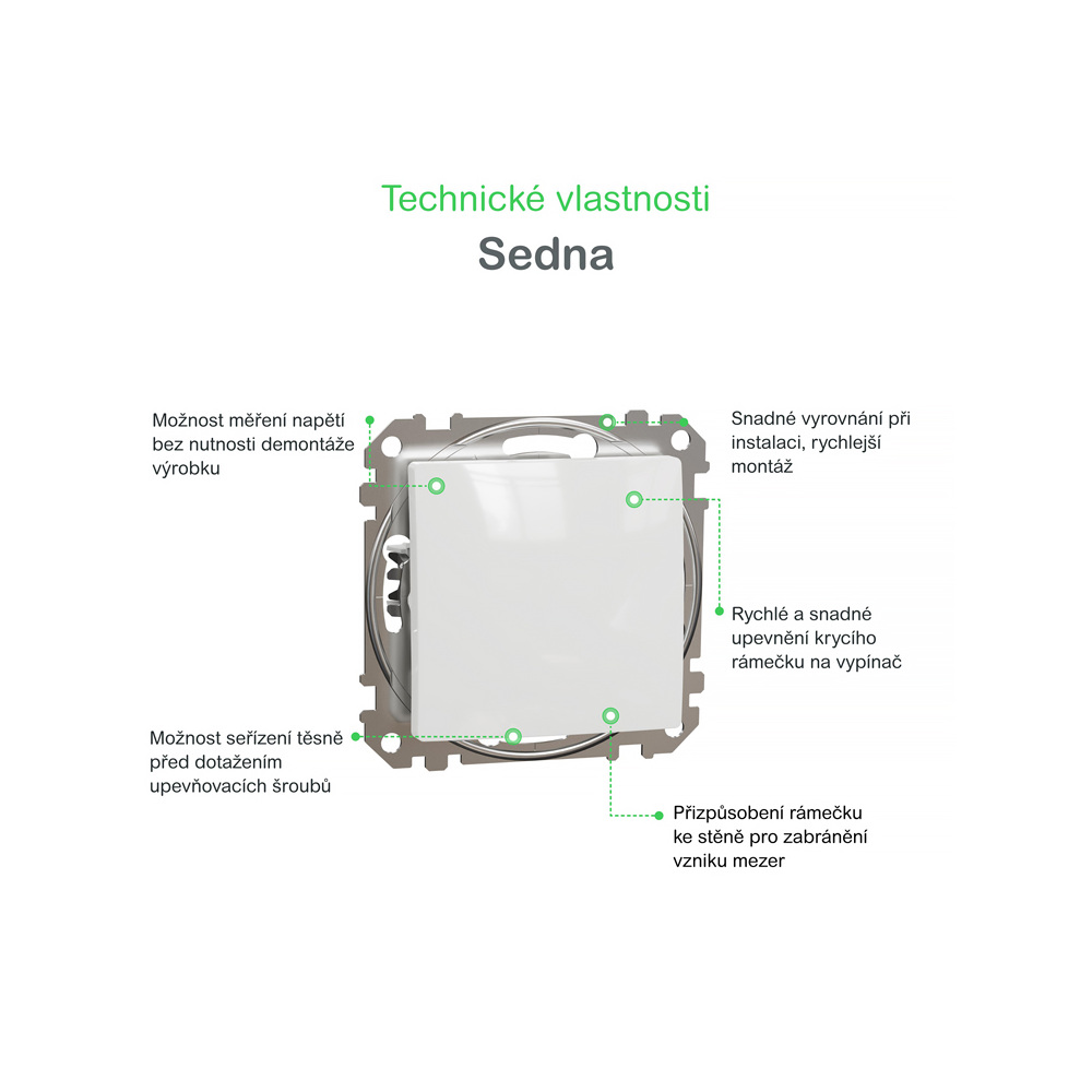 Toto je mechanizmus vypínača Schneider Electric Sedna Design & Elements s montážnym rámom. Toto je jednocestný vypínač. Na ovládanie sa používa kolíska/tlačidlo. Pripojenie zariadenia je pomocou bezskrutkových svoriek. Spôsob upevnenia zariadenia je pomocou skrutiek a rozperiek. Jeho menovité prevádzkové napätie Ue je 250 V AC pri 50/60 Hz. Menovitý prúd je 10AX. Toto zariadenie je určené na zapustenú montáž. Rozmery produktu sú (Š) 73 mm × (V) 73 mm × (H) 37 mm. Výstupná hĺbka je 24 mm. Je vyrobený z termoplastu ABS stabilizovaného proti UV žiareniu. Farba produktu je biela s lesklou povrchovou úpravou. Dosahuje stupeň krytia IP20. Sedna Design & Elements je nová generácia elektrických vypínačov inšpirovaná módou a interiérovým dizajnom. Vďaka moderným líniám, ktoré odrážajú dnešné trendy, a prepracovanej estetike je Sedna viac než len doplnok. Sedna Design & Elements ide ešte ďalej z hľadiska ergonómie, jednoduchosti inštalácie a používania, spoľahlivosti a kvalitného vyhotovenia. Produkt je v súlade s normou IEC 60669-1. Má certifikáciu GOST-R.