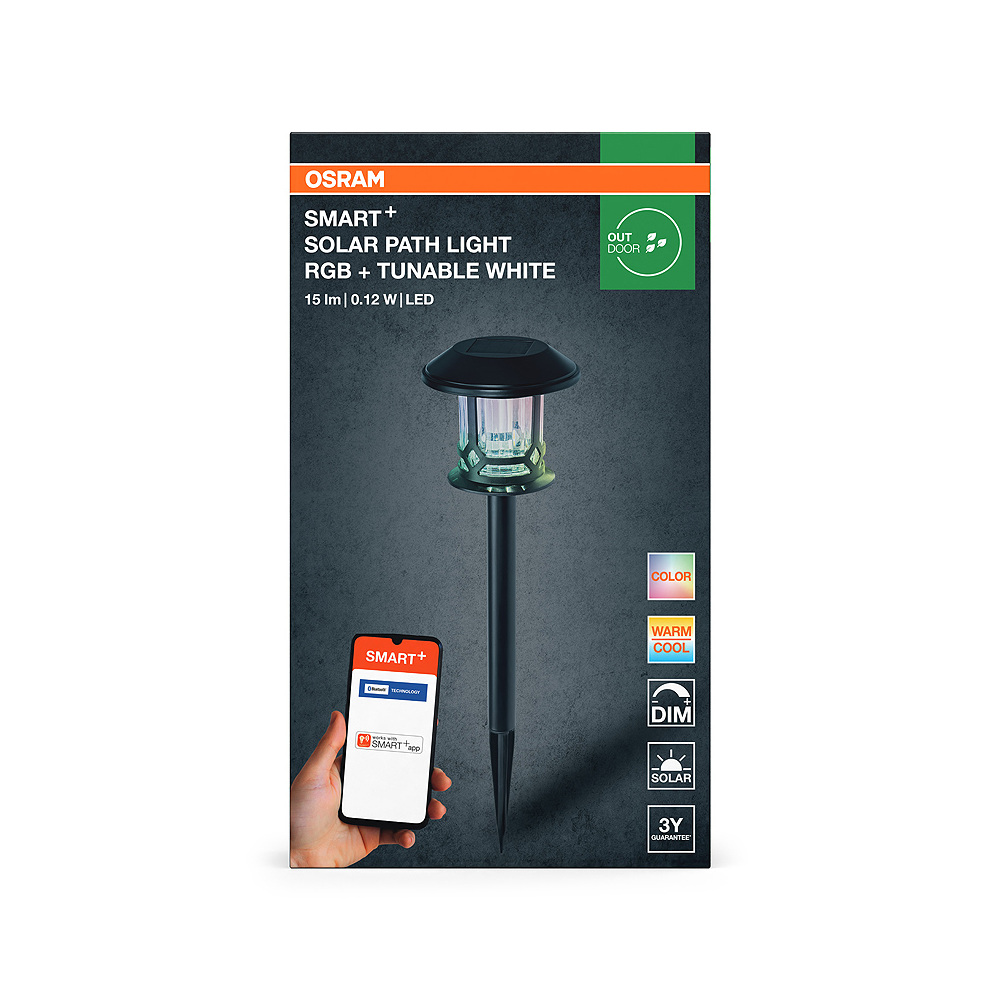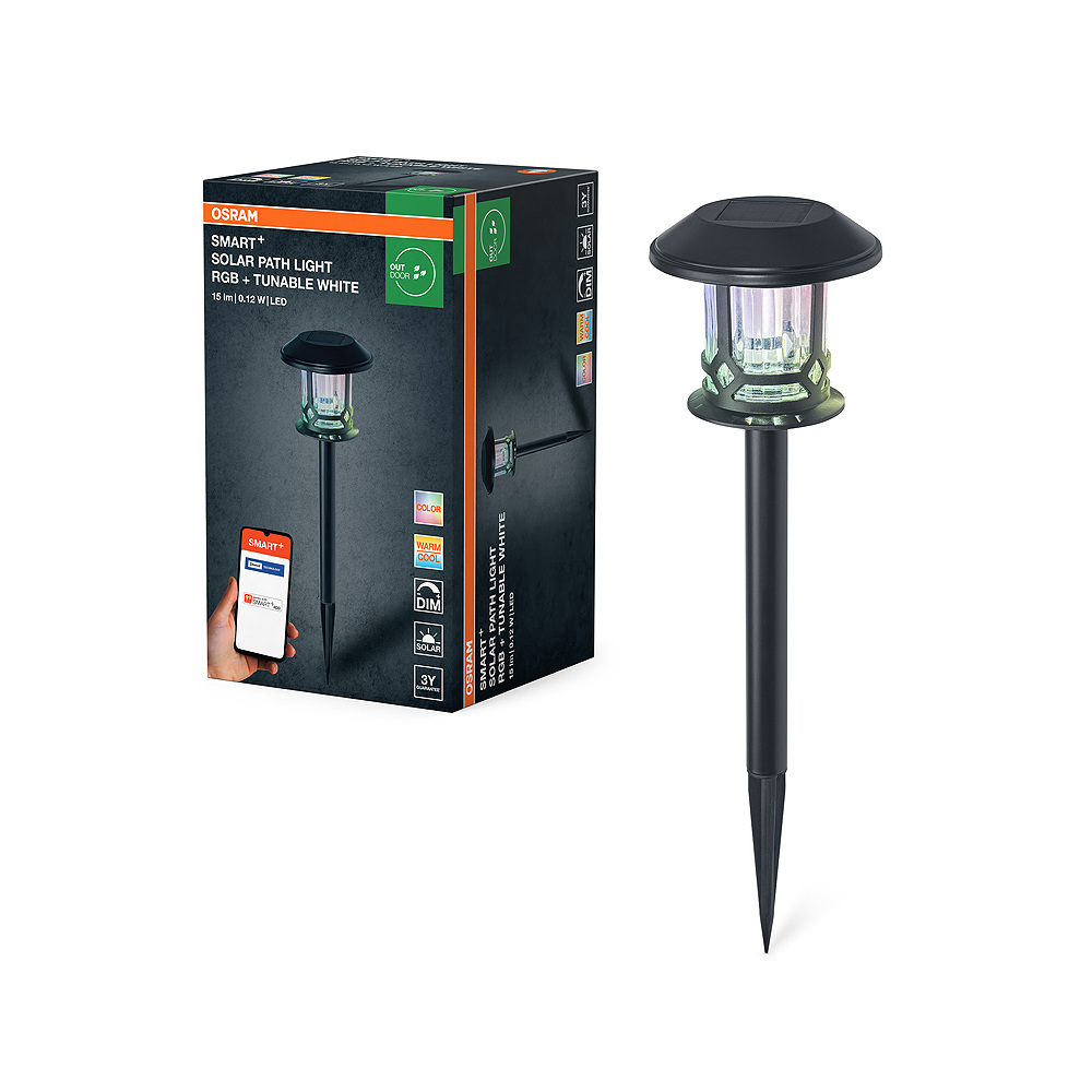 Smart vonkajšie solárne záhradné LED svietidlo, zapichovacie, ovládanie farieb RGB, stmievateľné - príkon: 0,12 W • napätie: 3,2 V • svetelný tok: 15 lm • teplota farieb: 3000…6500 K • farba svetla: RGBTW • uhol lúča: 175° • ochrana: IP44 • materiál: sklo+hliník • farba: čierna • výška: 56 cm